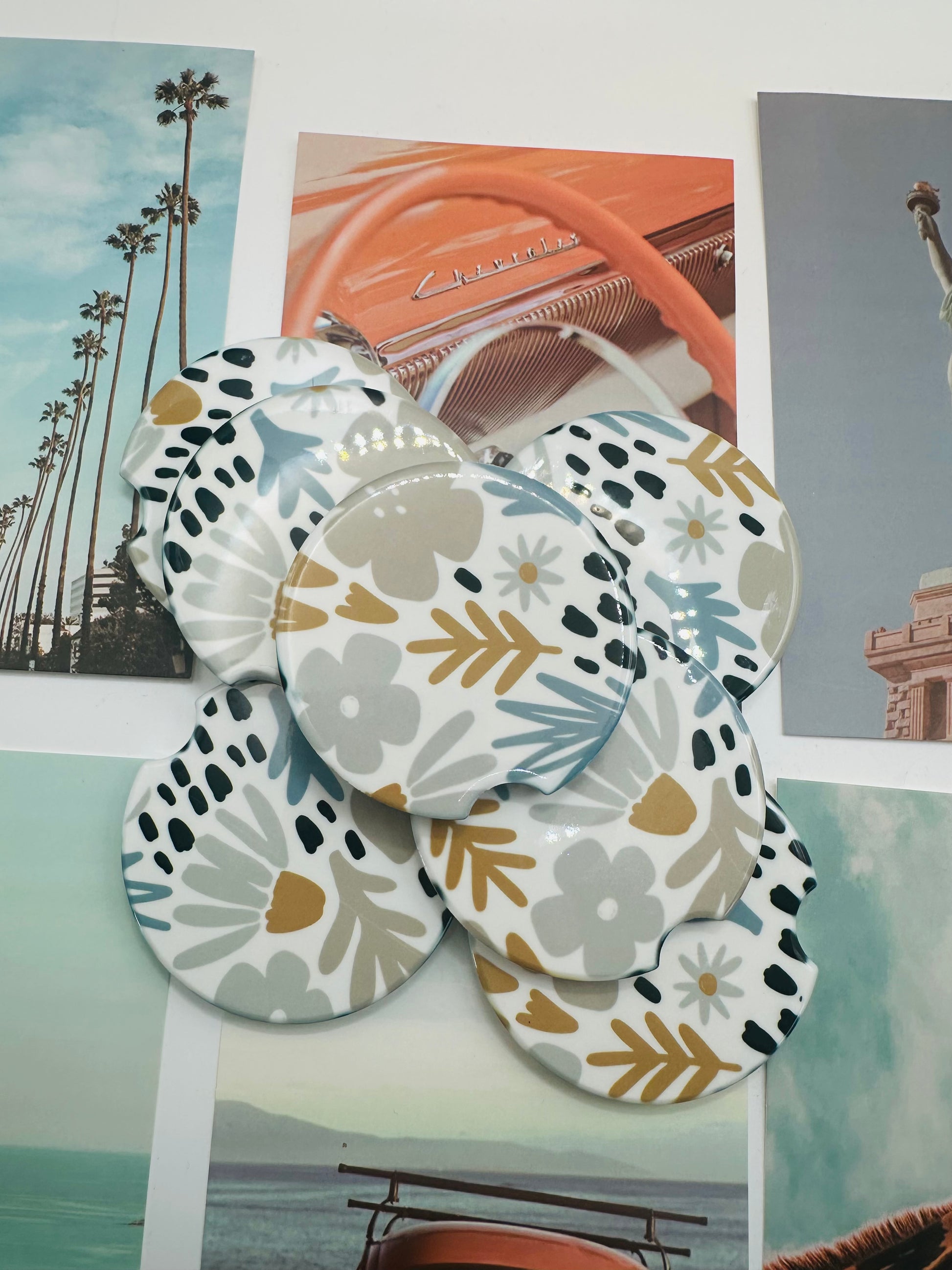 These absorbent coasters fit perfectly in most standard car cup holders to catch drips, spills, and condensation. Made from durable ceramic with a stylish design, they're both functional and fun—just pop them in and enjoy a cleaner, more personalized ride.