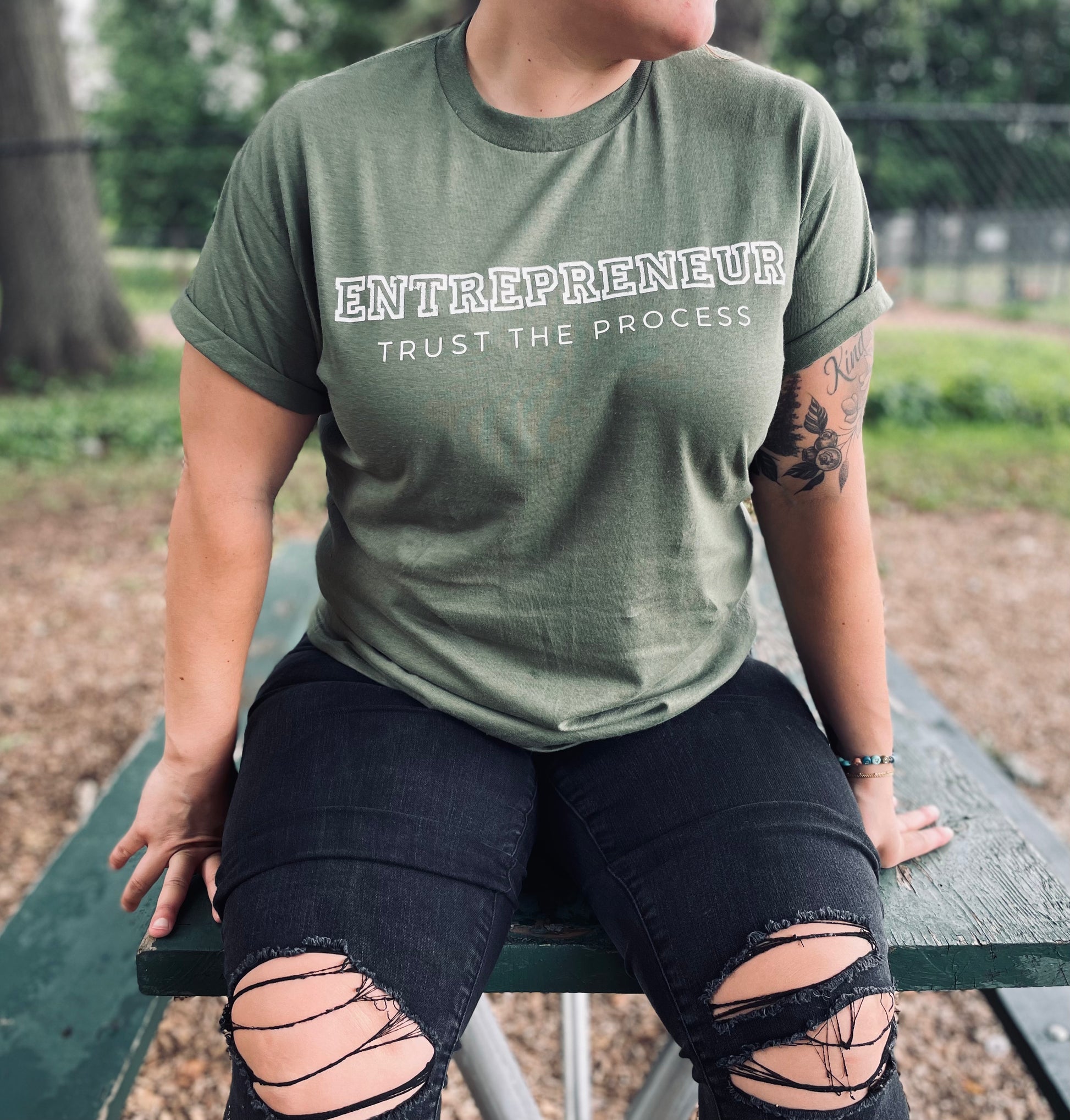 Built for the hustle, designed for the grind. This army green tee features the bold phrase “Entrepreneur – Trust the Process,” a perfect reminder to keep pushing forward no matter the challenge.