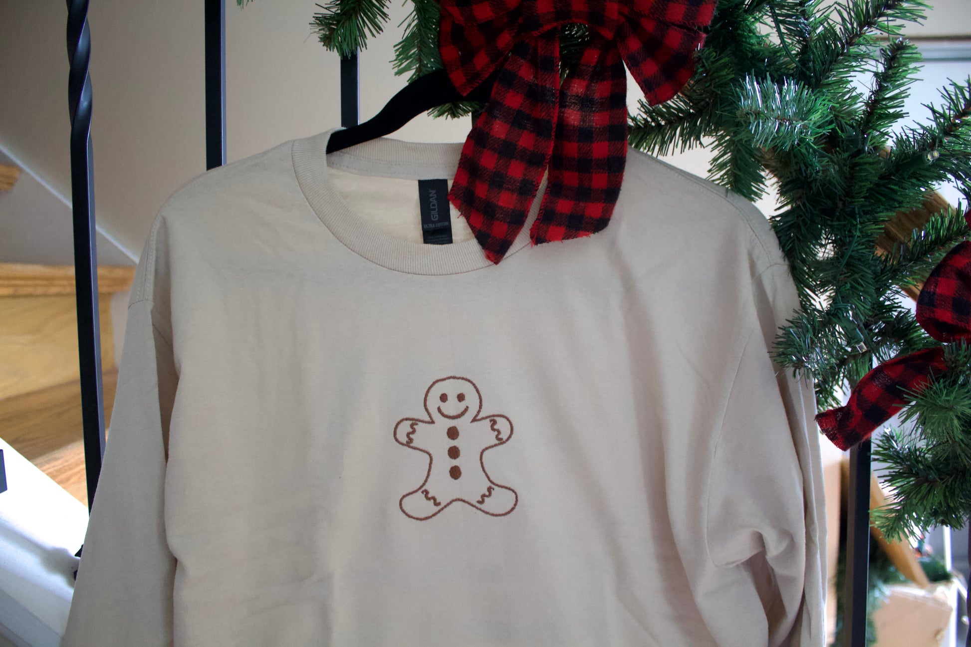 Keep it cozy with Gus, the cutest little gingerbread man of the season! This cream Gildan tee, long sleeve, or crewneck that features an embroidered gingerbread man on the front and a gingerbread cookie recipe printed on the back — the perfect mix of festive and nostalgic.