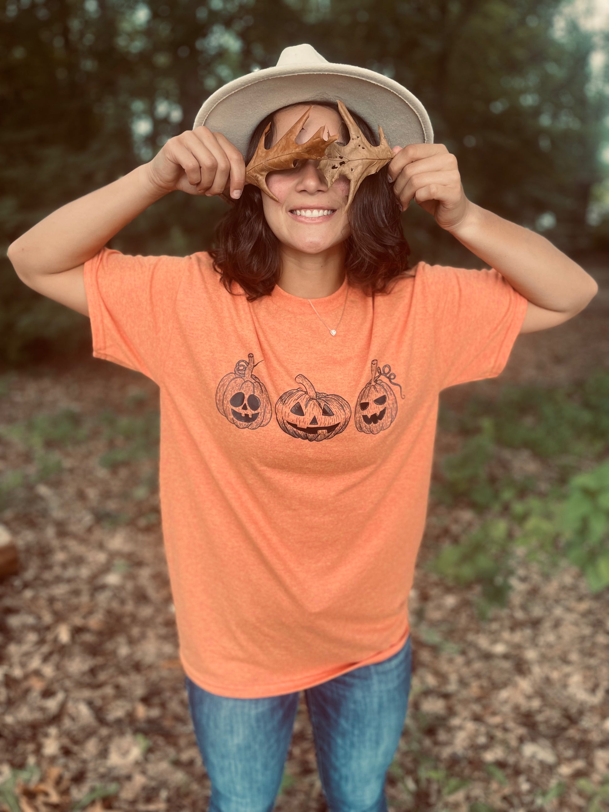 Nothing says fall quite like pumpkins—and this tee brings all the cozy autumn vibes! Featuring a simple design of three charming pumpkins across the chest, this lighthearted tee is perfect for pumpkin patch trips, crisp fall days, or sipping cider with friends.